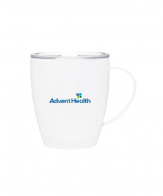 12 oz double wall 18/8 stainless steel thermal mug with copper vacuum insulation, clear acrylic push-on lid, and matching swivel; Hand wash recommended; Do not microwave; 4-7/16" h x 4"w (4-7/8 with handle) ; 355mL.