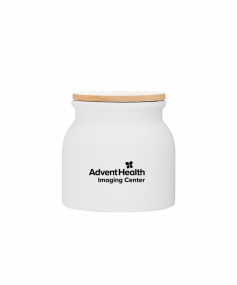 16.9 oz stoneware: matte white out / glossy white in with push-on bamboo lid; Hand wash recommended; Microwave safe with non-metallic imprint; 4 3/16 h x 4 3/16 (w/handle) w ; 500mL.