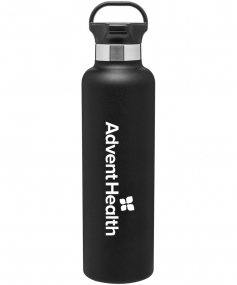 24 oz powder coated double wall 18/8 stainless steel thermal bottle with copper vacuum insulation, threaded gear-shaped insulated lid and carrying handle Complies with FDA, Prop 65. 11.25" H x 3" W