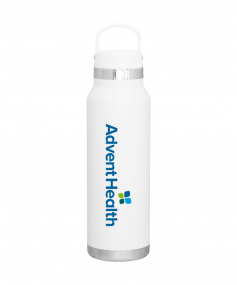25 oz double wall 18/8 stainless steel thermal bottle with copper vacuum insulation, threaded insulated lid with carrying handle, high polish accent, stainless steel base, and powder coated finish. Hand wash recommended; Do not microwave. Dimensions: 10 H x 3".