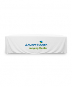 8 ft. Premium PolyKnit throw table cover with one color logo. Fits a 96 inch wide x 30 inch deep table. All corners are rounded meaning they will not gather and lay on the floor. Floor length on 4 sides. This cloth requires no ironing, is EasyCare machine washable and dryer safe.