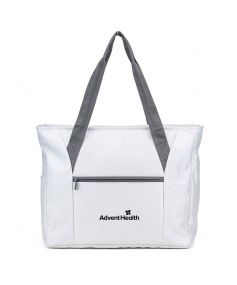 Modern, functional, and fashionable 1680D cross weave tote for work or leisure. Features front exterior zip pouch and side pocket; interior organizer pockets. 13 1/2" H x 19" W x 7 3/4" D.