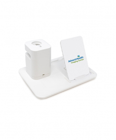 The 3-in-1 charging dock. Tired of fumbling with messy wires and unsafe charging cords? The Docksy is your three-in-one charging solution. Ideal for a nightstand or counter, the Docksy allows you to recharge each of your smart devices at once! 6" W x 8" L x 4.3" H