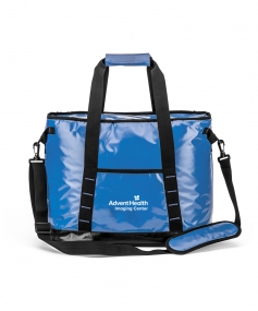 40C Tarpulin water resistant cooler bag. Gray PEVA insulated lining; detachable and adjustable padded shoulder strap; hook and loop wrap handle and side grab handles; piping accents. 10" D x 13 3/4" H x 18" W.