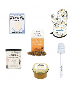 Getting out of bed has never been this appealing. Delicious breakfast treats w/designer kitchen accessories. Start your day in style w/a smile. Includes: HAYDEN FLOUR MILLS White Sonora Pancake Mix, BIG SPOON ROASTERS Honey & Sea Salt Peanut Butter, BANNER ROAD BAKING COMPANY The Original Organic Granola, & BIG HEART TEA CO. Cup of Sunshine Tea. Includes a customized Marble Silicone Spatula & Luxe Oven Mitt. Complies with Prop 65. 12" W x 6" H x 12" D
